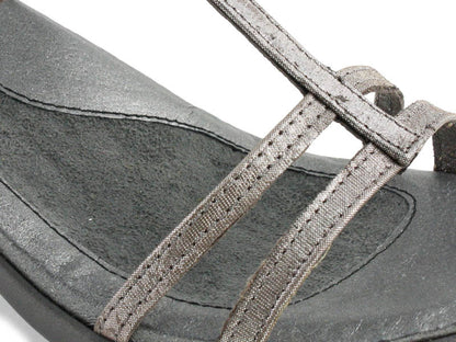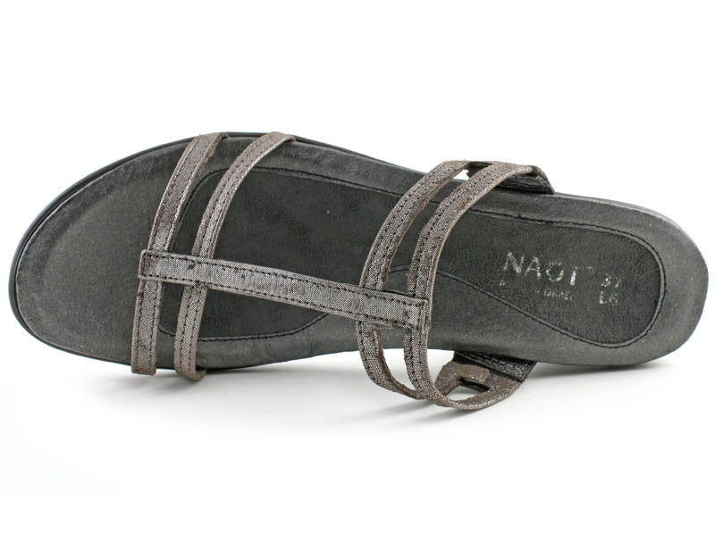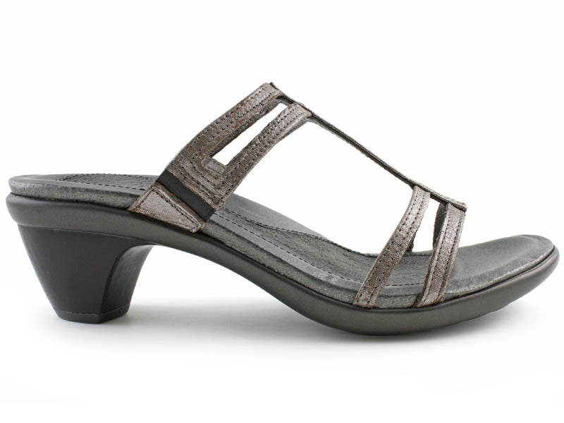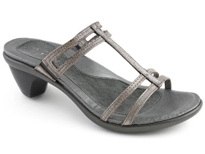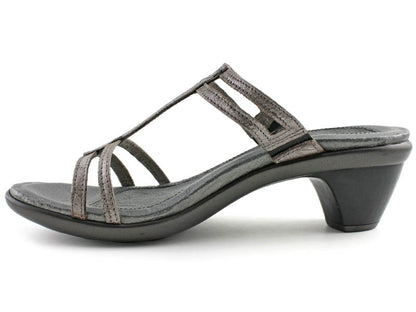 Naot figured out what women want in the perfect heel: the Naot Loop Womens Dress Sandal is a 2½ heel that is comfortable and supports your foot. This dress sandal offers height without discomfort, provided by Naots anatomic cork and latex footbed that conforms to the foot with wear for a custom fit. The upper is a delicate strap design for an elegant look in a silver leather. The footbed is also wrapped in leather with a microfiber center to prevent slippage. If youre looking for a heel that is as comfortable as it is stylish, the Naot Loop Womens Dress Sandal is a top candidate.- Slide sandal