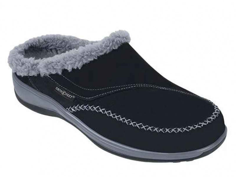 The Orthofeet Slippers for Women are super adjustable slippers with a wide opening and a removable anatomical insole, which can be replaced with diabetic customized insoles. These soft Orthofeet Charlotte women's slippers have a furry collar and stylish stitch detailing on the upper. You'll love the superior cushioning and support of the anatomical insole. These women's diabetic slippers have an adjustable strap at the instep which opens up the side and top of the slipper for easy adjustability. These Orthofeet Charlotte women's slippers come in both medium and wide widths. The rubber outsole adds durability when stepping outdoors. The Orthofeet Slipper for Women accommodate your foot care needs in soft, cushioning comfort.