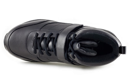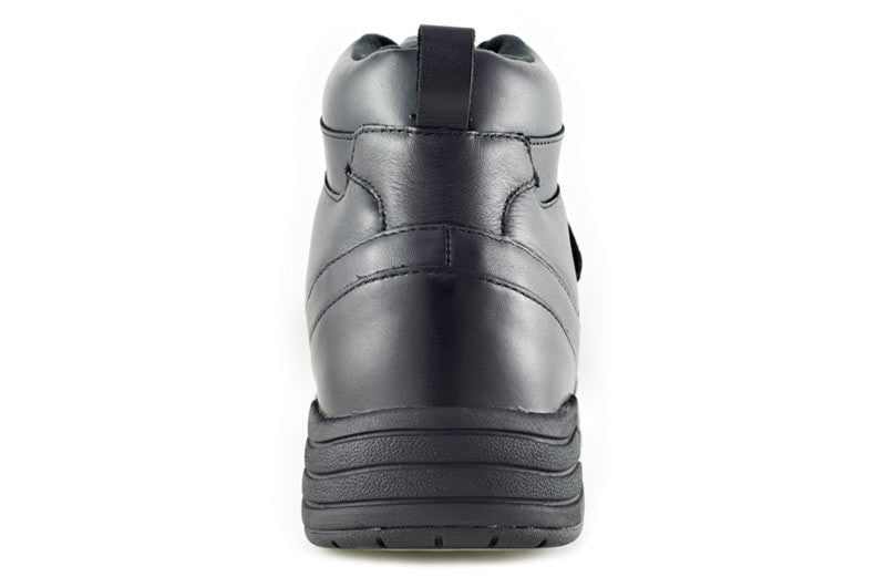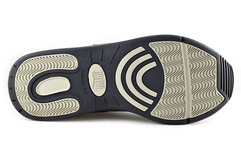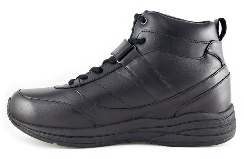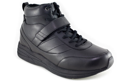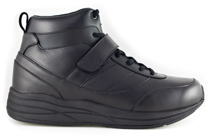 The Drew Pulse Men's Athletic High-Top Shoe offers supreme orthopedic features to lessen pain or discomfort caused by unhealthy foot problems such as Hammertoes, Arthritis, Bunions, Edema, Plantar Fasciitis, and Ankle Pain. The shoe has a leather upper and features a full lace closure design with a single hook and loop strap that fastens over the instep for a secure fit. The foam-padded collar and cushioned tongue means added comfort; and one will also gain more room in the toe area because of the full rounded toe design. This orthopedic athletic high-top shoe comes with added depth and doubled added depth, plus it can accommodate custom orthotics due to Drew's Plus Fitting System® that consists of two removable footbeds. Drilex® lining and AEGIS Microbe Shield will help keep feet dry and cool by wicking moisture away. Stability and support are provided by the tempered steel shank and the extended medial heel stabilizer, whereas the EVA midsole and rubber outsole offer durability. Gait will also improve since the Pulse comes with a wide shank and rocker bottom design, which will also correct posture. The Drew Pulse Athletic High-Top shoe for men has it all: durability, orthopedic value, and all day comfort.- Soft leather upper