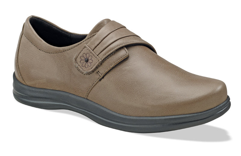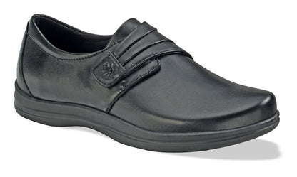 The Apex Linda Women's Monk Strap Shoe offers lightweight comfort and support with an easily adjustable fit. This women's orthopedic shoe features a rich supple leather upper with classic monk strap with elegant flower detailing and hook-and-loop closure. Medial side goring offers a more comfortable fit. Soft fabric lining wicks away moisture to keep feet healthy and dry while the roomy toe box allows toes to spread out. Walk confidently with a firm heel counter for added stability. The slip-resistant sole is injected with EVA to provide protection without any added weight. Double removable depth accommodates custom orthotics. The Apex Linda Women's Monk Strap Shoe offers ultimate stability and support without weighing you down.