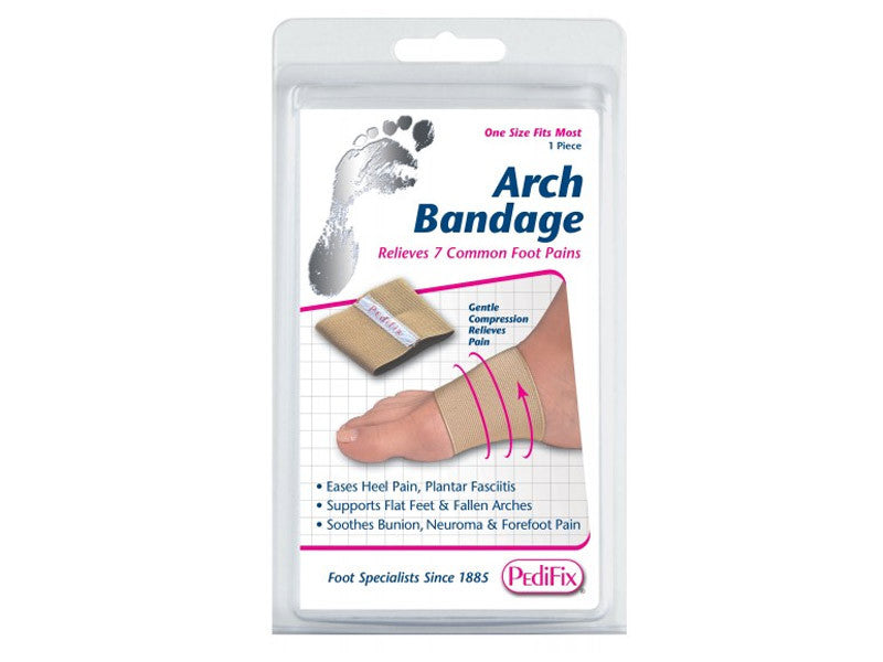 The Pedifix Arch Bandage gently compresses and supports the arch of the foot providing both support and motion control. This cotton-elastic compression bandage gently squeezes bones to improve structural positioning. Helpful for plantar fasciitis, heel pain, flat feet, and fallen arches. Fit in most shoes. Washable. Package of 2.Features